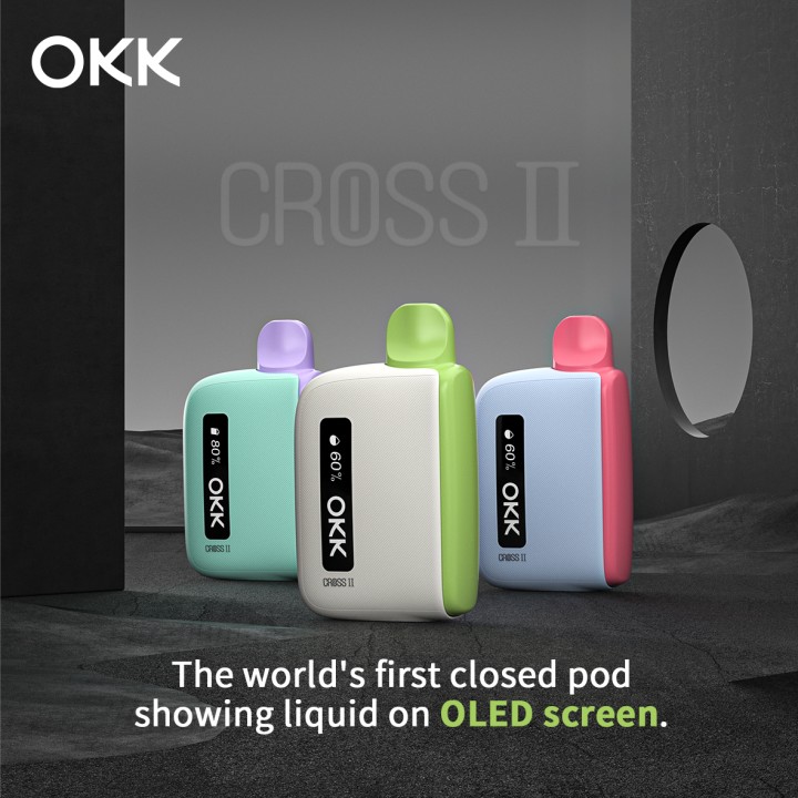 The new OKK Cross 2 Device, it’s a replaceable pod device with a juice box design. The world’s first closed pod showing liquid level on O-LED screen. O-LED screen shows the estimated liquid level and battery life.